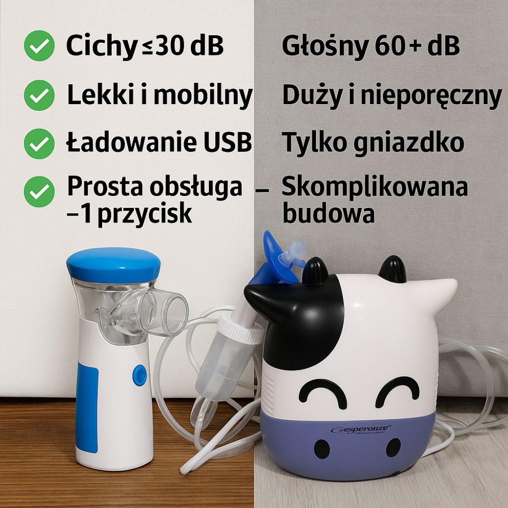 Moje dziecko bało się dużych inhalatorów, a ten jest cichy i wygląda niegroźnie. Szybko działa, nie trzeba go podłączać do prądu – w podróży niezastąpiony!