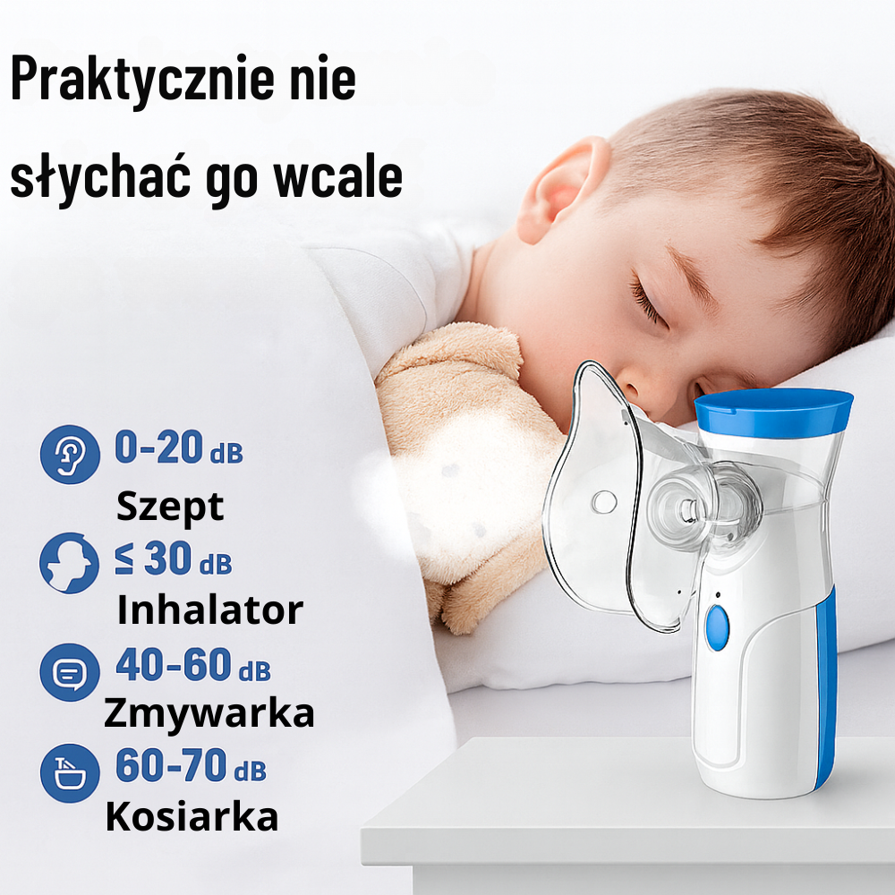 - Bezpieczne dla całej rodziny – dzieci, dorośli i seniorzy mogą korzystać w domu, w podróży czy nawet w nocy. Ciche działanie (≤30 dB) sprawia, że inhalacja nie przeszkadza nikomu.